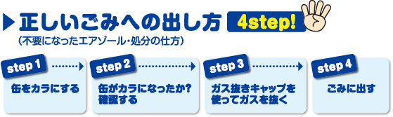エアゾール製品は、容器の耐圧強度と気密性によって、使いきるまで安全性が保たれていますが、多くの製品は、液化石油ガス(LPG)やジメチルエーテル(DME)などの可燃性ガスを噴射剤として使用している為、中身が残っているエアゾール製品の容器に、不用意に穴をあけたり、中身が残ったまま“ごみ”に出すと、火災や破裂事故につながることがあります。