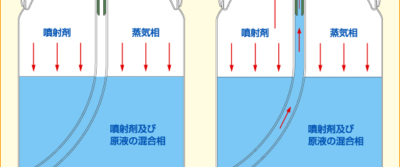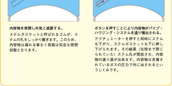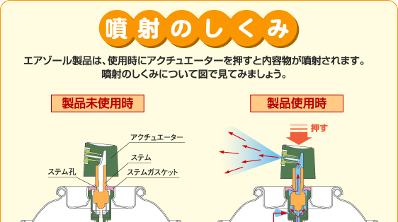 エアゾール製品は、大きく分けてキャップ、ボタン・バルブ・ディップチューブ、耐圧容器の3つの部分からなります。アクチュエーターと呼ばれるボタンを押してバルブを開くと、容器内で圧力をかけられている原液と噴射剤の混合内容物が、ディップチューブを通ってボタンの孔からいっきに放出されます。放出された内容物は、減圧による噴射剤の急激な膨張によって細かい霧や泡になる、という仕組みです。